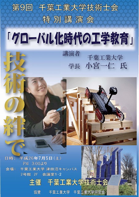 平成26年10月4日(土)に東京工業大学蔵前会館1Fくらまえホールにおいて「一般社団法人 蔵前工業会主催の第31回蔵前科学技術セミナー」が開催され、千葉工大技術士会から2名が聴講しました。