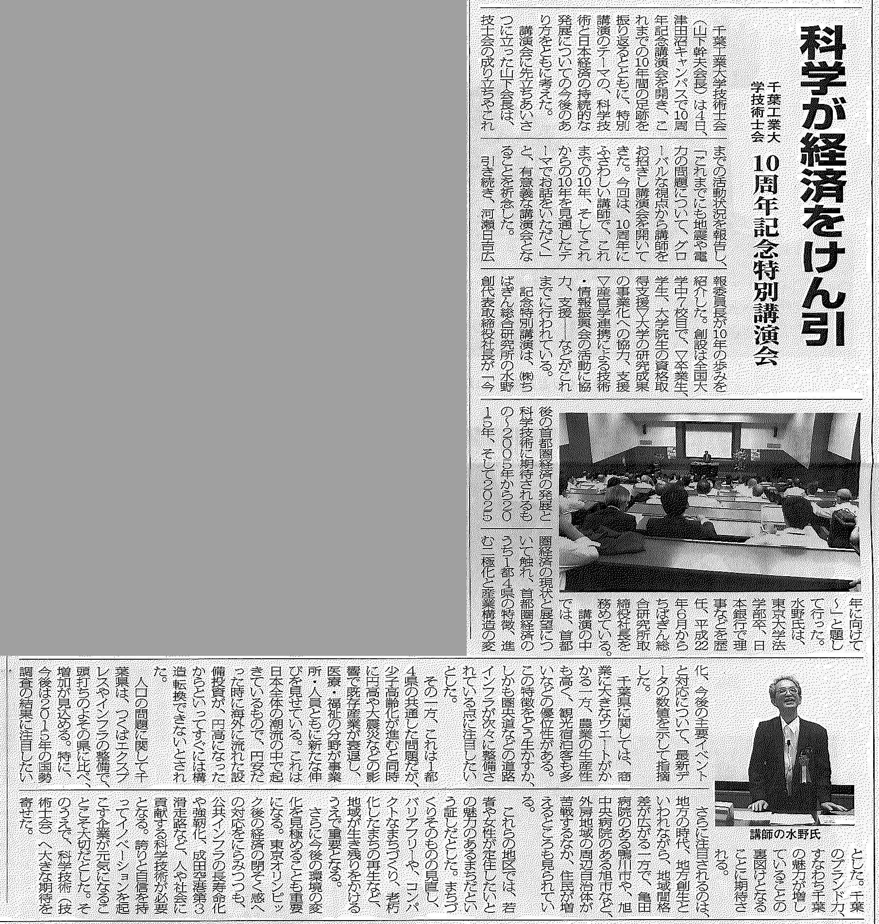| 《開催目的》 | 10周年の節目を迎える千葉工業大学技術士会は、建学の精神「世界文化に技術で貢献する」を鑑み、師弟同行、師弟共生の教育目標を遵守し今日まで活動を行って参りました。 一方、世界経済がめまぐるしく激動する時代、科学技術がいかに経済社会活動に貢献できるかをテーマに捉え、今後も本技術士会が積極的な活動促進を図り、世界文化に広く貢献できる技術者集団としてより一層活躍することを目的にしたいと考えております。 そこで今回は、特別講演者として日本の中枢において金融界に大きな成果を上げてこられました、ちばぎん総合研究所 取締役社長 水野 創様(元日本銀行理事)をお招きし、「今後の首都圏経済の展望と科学技術に期待されるもの」について、これまでの10年間、そしてこれからの10年を展望し、幅広い知見をお伺いしたいと企画いたしました。 |